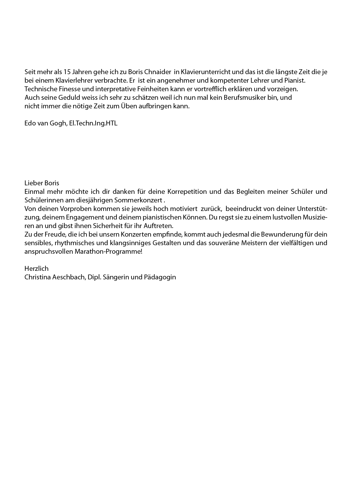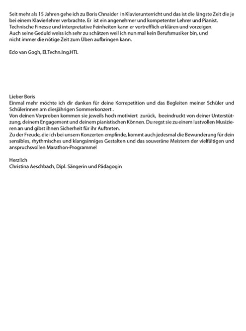 Hiermit bestätige ich, dass Boris Chnaider ein sehr tüchtiger Musiker und sehr guter Pianist ist, der über grosse Kenntnisse sowohl in der Opern- als auch in der Liedliteratur verfügt. Er arbeitet sehr engagiert mit seinen Partnern zusammen und schafft dadurch eine sehr lebendige Atmosphäre.Ich kann ihn bestens weiterempfehlen.